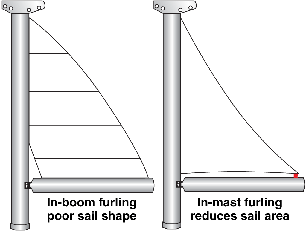 Aan de andere kant kan het rol-grootzeil nooit het perfecte profiel bereiken (zie foto) en hierdoor zullen de prestaties en performance van het zeil minder zijn. Denk aan snelheid, trim, aan de wind varen en ook controle. Dit in tegenstelling tot het volledige latzeil.